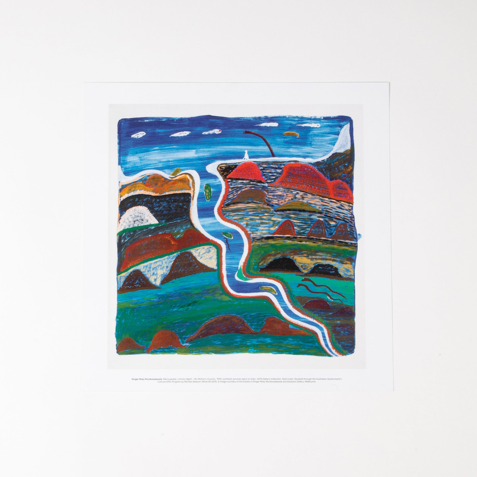 Created exclusively for HOTA, this square print features the artwork Limmen Bight – My Mother’s Country, 1993 by Ginger Riley Munduwalawala.