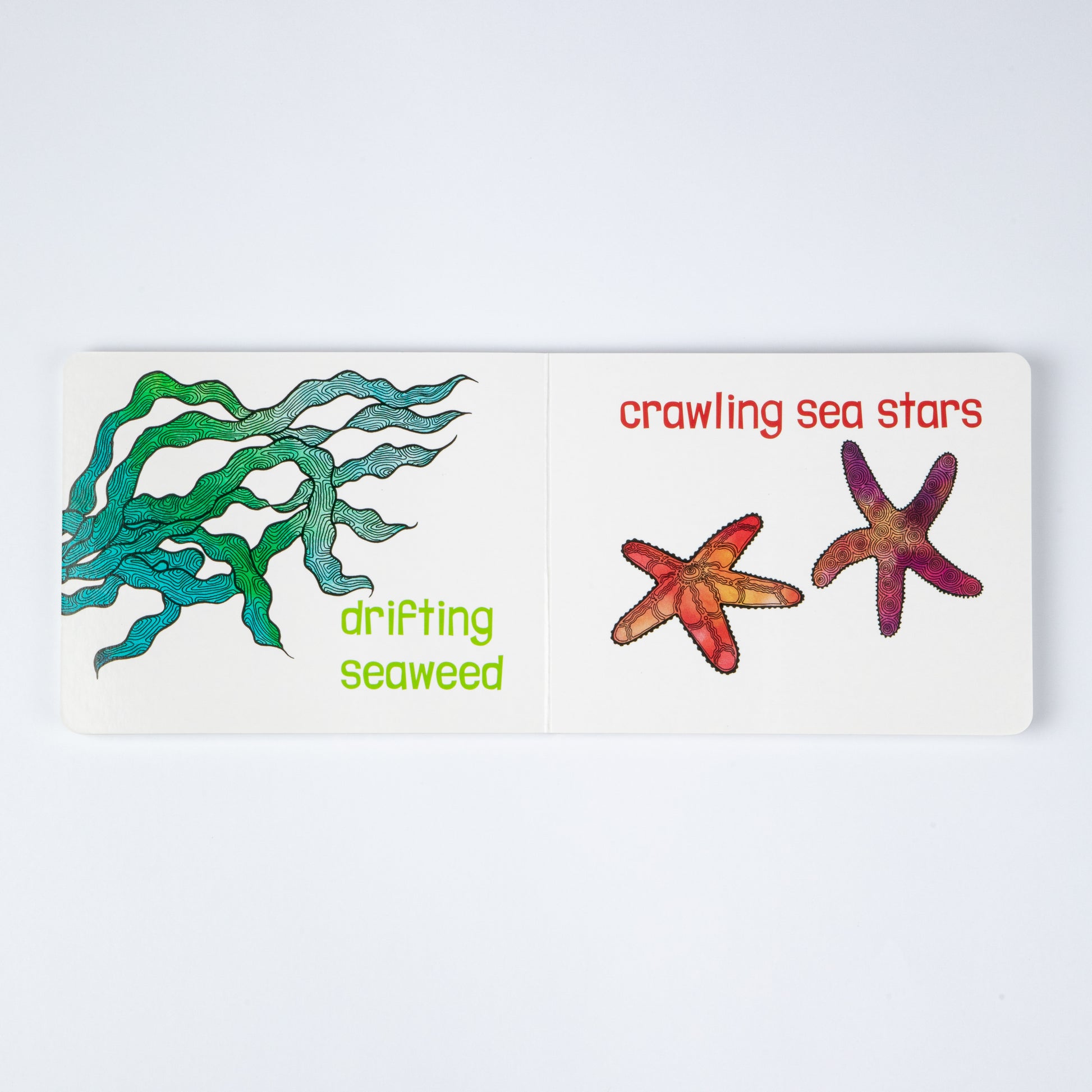 Dancing jellyfish, scuttling crabs, scattered shells, drifting seaweed and waving coral evoke the wonder of our beaches and the treasures to be found.