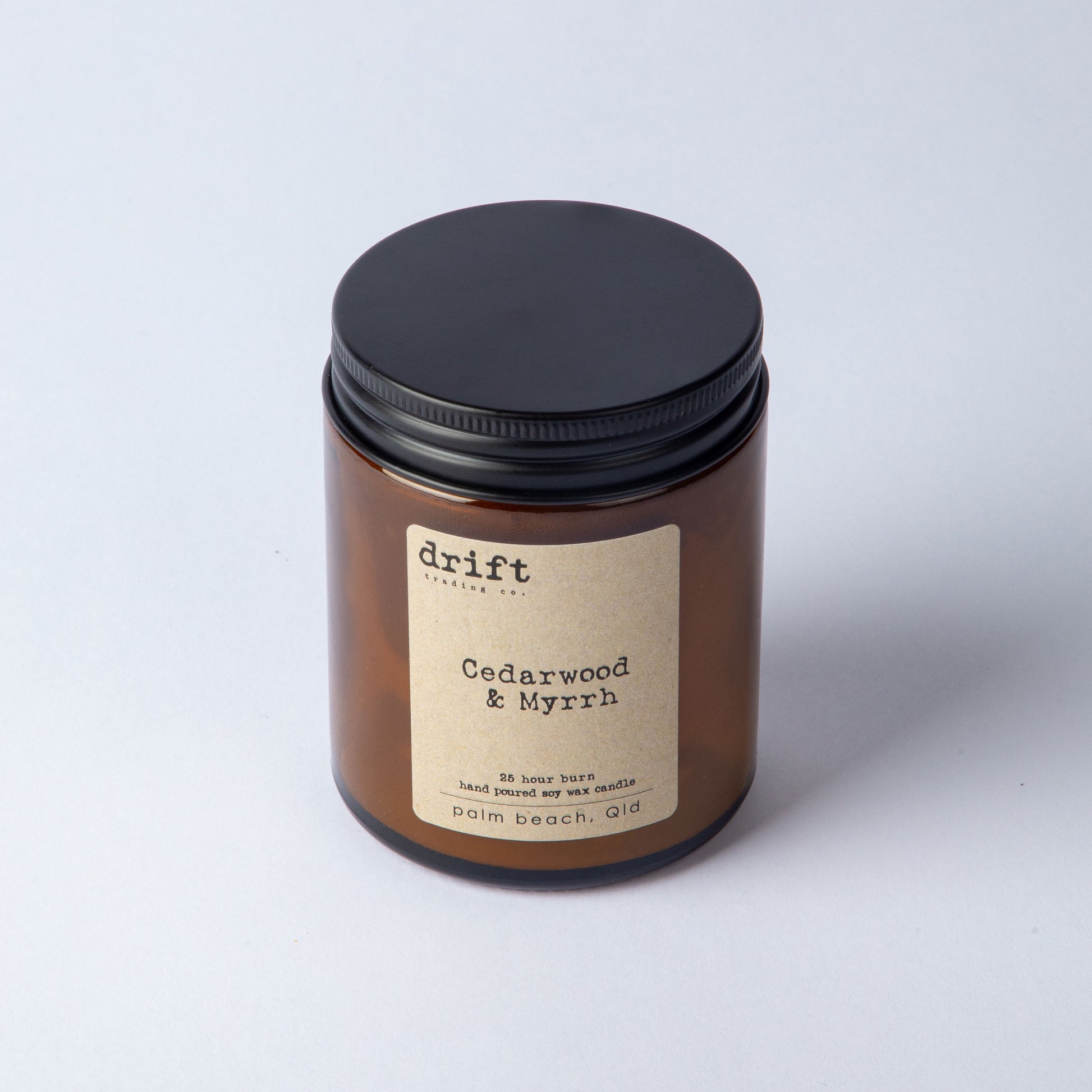 A warming blend of musky myrrh and earthy cedarwood. Hand-poured in Palm Beach by Drift Trading Co.
