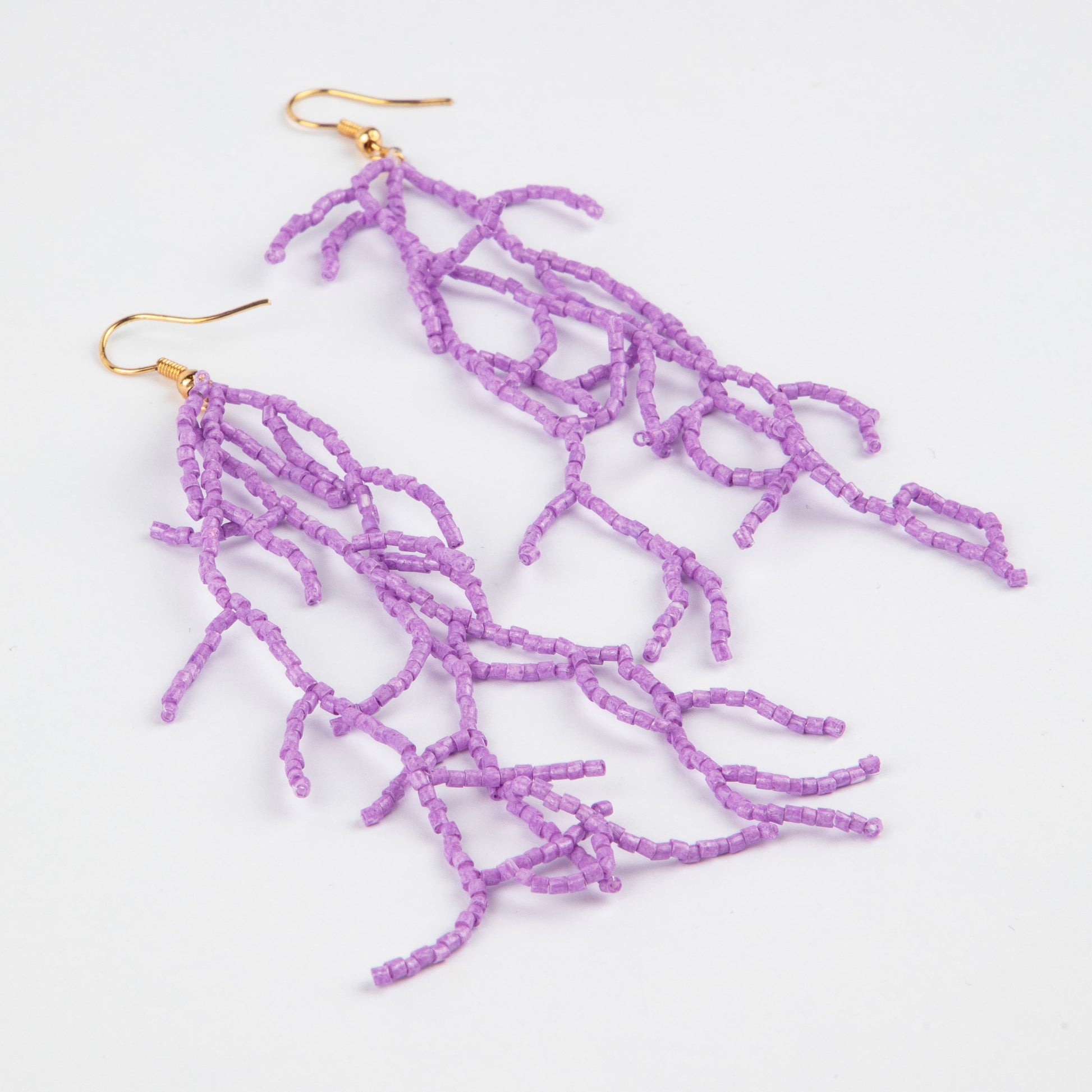 These purple glass bead earrings have a coral-inspired design and a secure hook fastening.