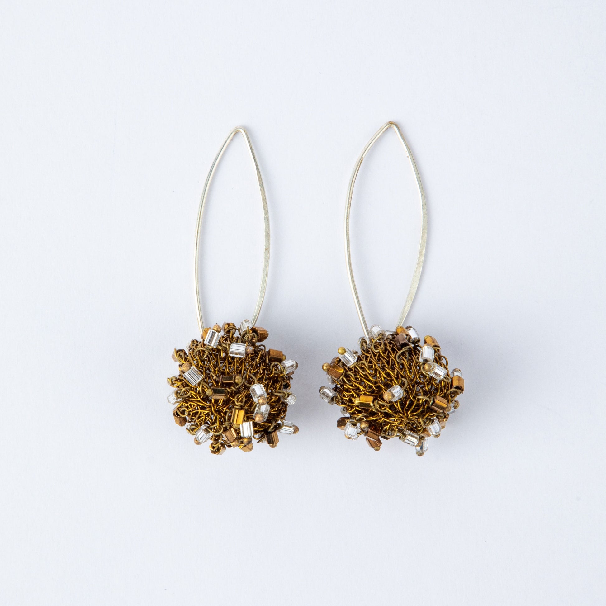 A pair of brass-coloured earrings with glittering Swarovski beads crocheted into the wire stitches.