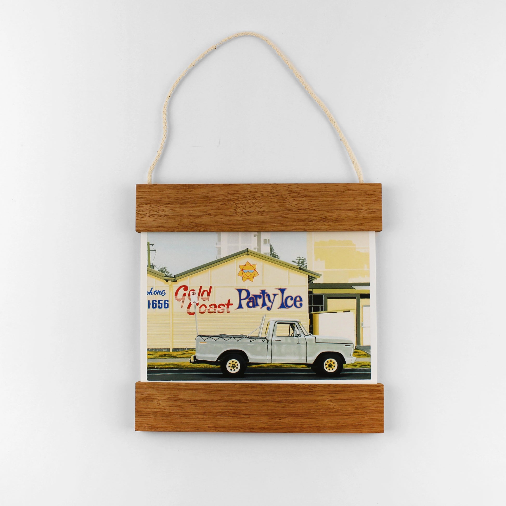 An adjustable hanging frame made from recycled hardwood for displaying your treasured greeting cards and postcards.