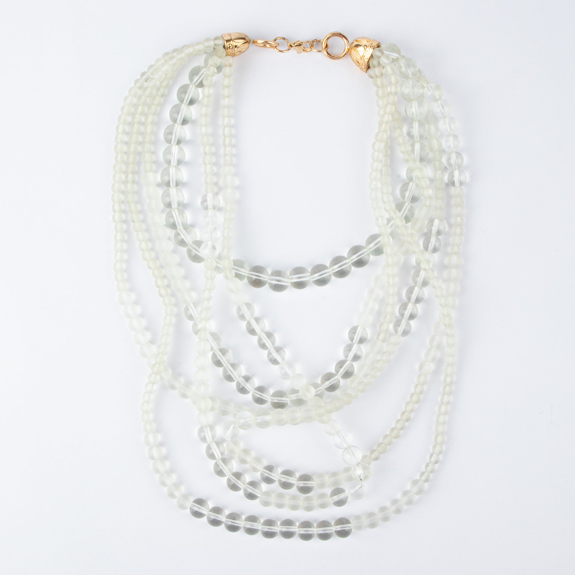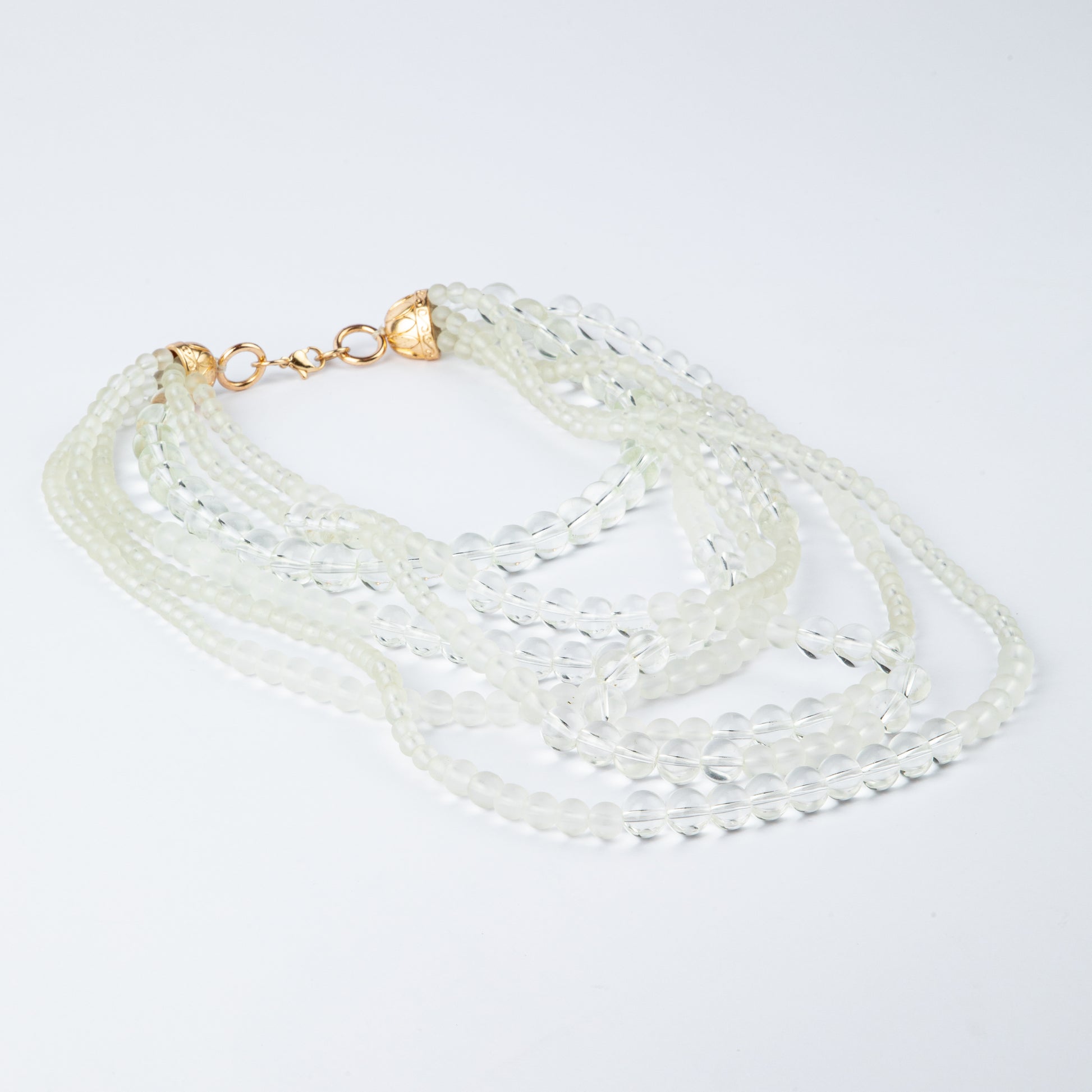A multi-stranded necklace threaded with larger clear beads, and smaller opaque beads both made of round glass and finished with a golden metal clasp.