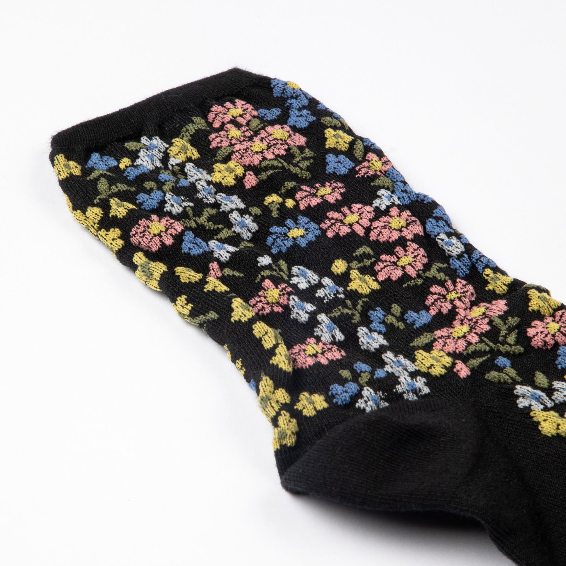 These black socks really pop with abundant pastel florals.