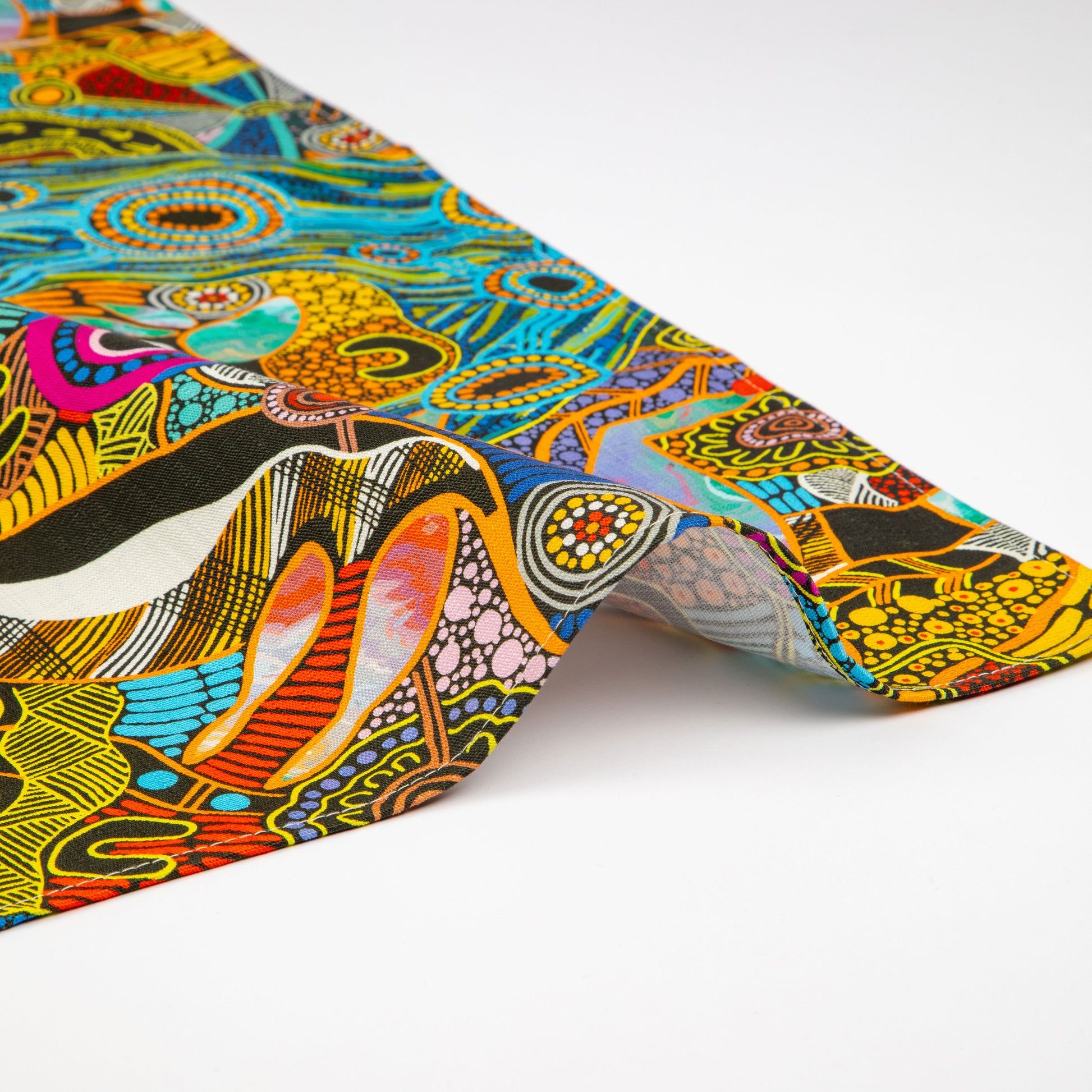 100% cotton tea towel featuring artwork of ‘The Dingo and the Kangaroo storyline’ by Justin Butler.